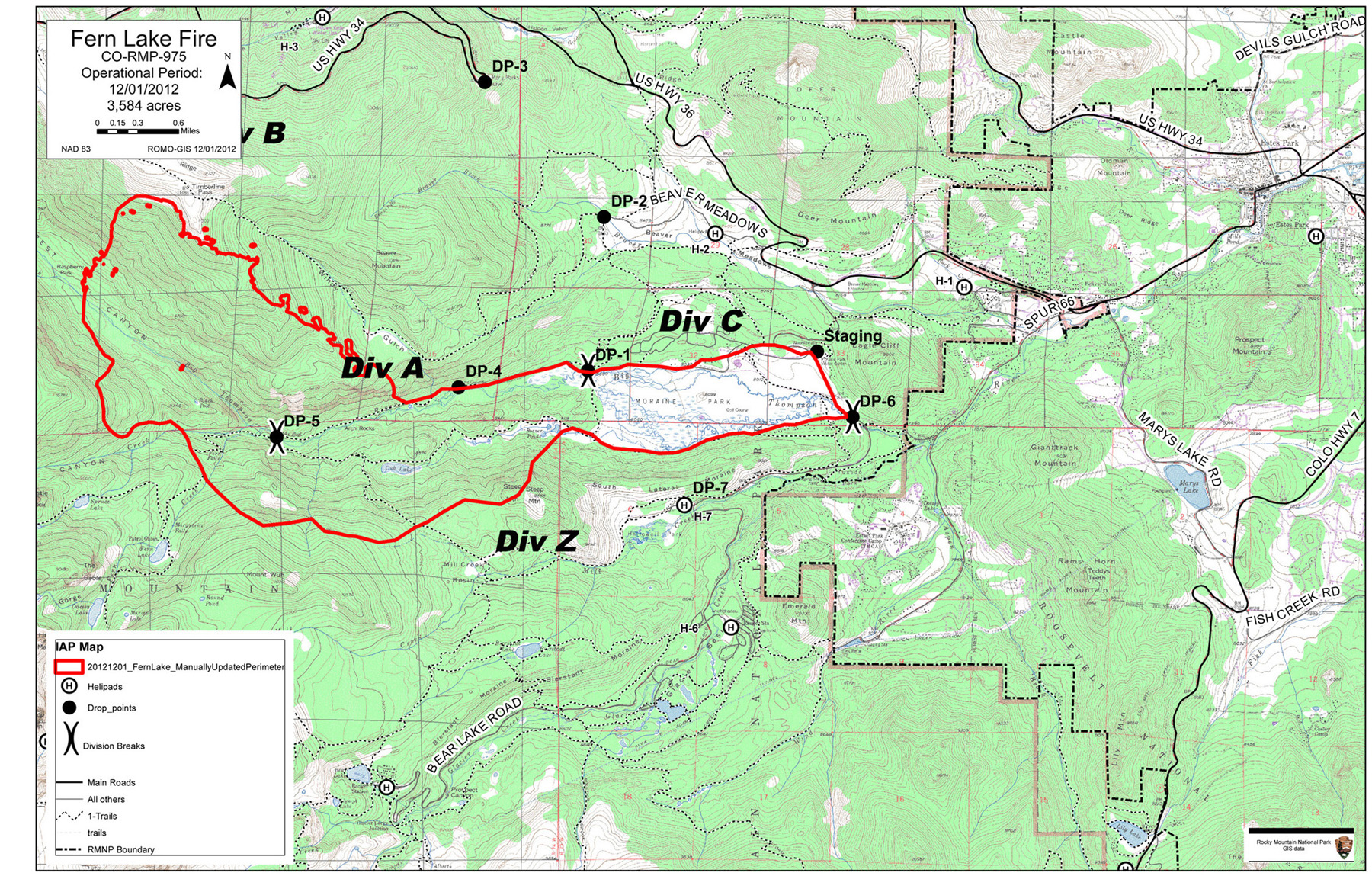 Updates on InciWeb confirm that the Fern Lake Fire in Rocky Mountain National Park raced 3 miles in 35 minutes early today, bringing the total burn area to 3,584 acres. Firefighters so far have kept the fire within the borders of the park, but smoke in the area is heavy, especially in the evening. Gusty winds kept air support on the ground all day. Both the Fall River and Beaver Meadows entrances to the park remain closed.